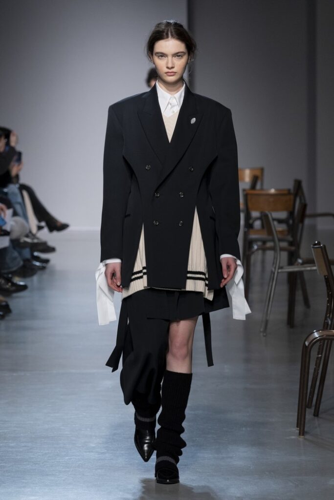 デザイナー自身の10代の体験が創作の出発点となった今シーズン。厳しい校則に抗いながらも、制服の着こなしを通じて個性を表現しようとした当時の記憶が、アイテムの随所に織り込まれている。特に、規定内であえて大きなサイズのベストを選び、丈の短いプリーツスカートと合わせることで、かつてのムーブメントを想起させるスタイルを提案した。