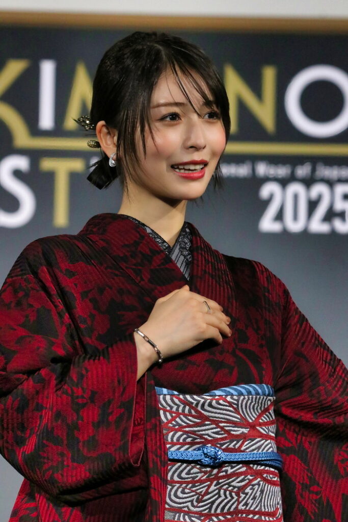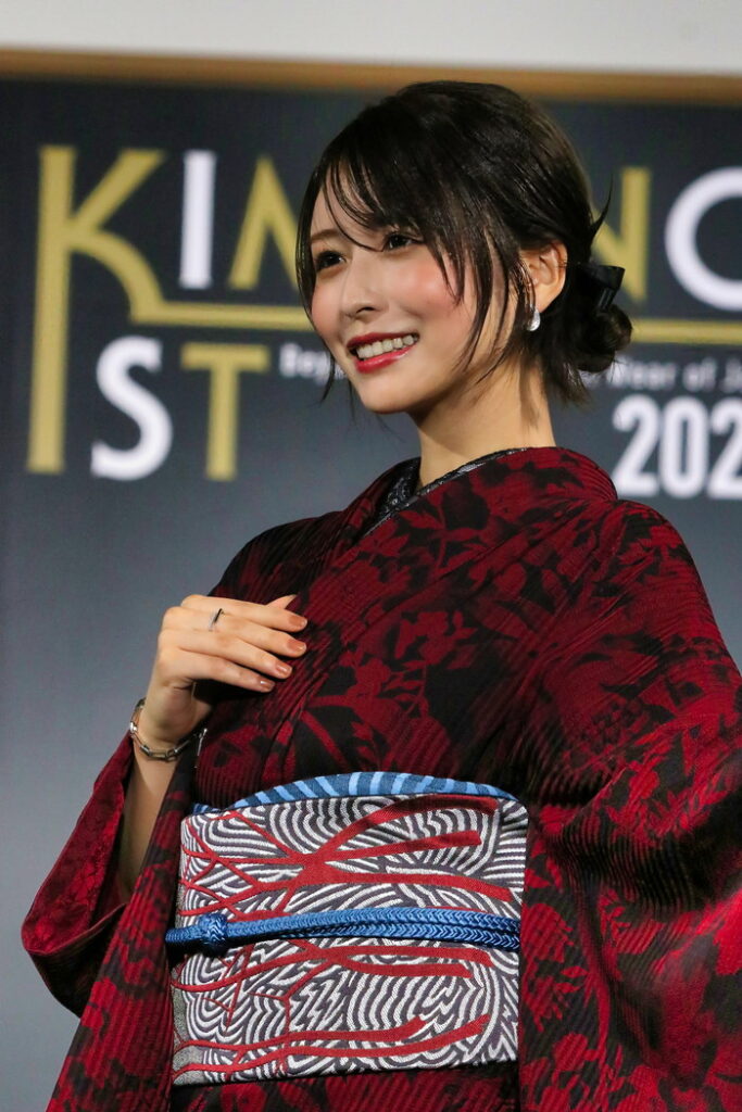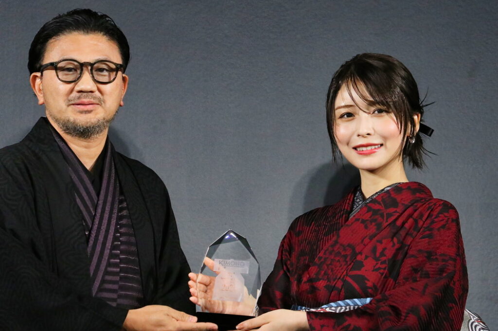 長濱さんは「受賞を聞いたときは驚きましたが、光栄に思いました。着物には背筋が伸び、所作まで美しくなる力があります」とコメント。「普段選ばないシックな赤が、自分の背中を押してくれるように感じました。斉藤上太郎先生から『ワンピースのように歩いてほしい』と声をかけていただき、着物をより身近に感じました。次世代にその魅力を伝えていきたい」と語った。