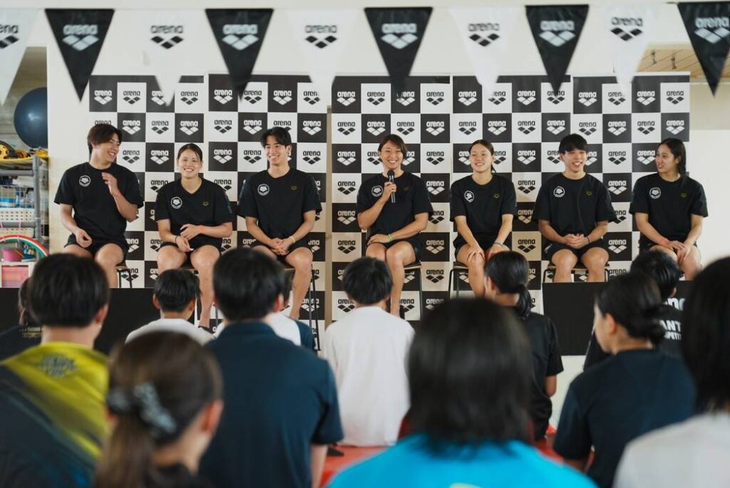 ジュニアからマスターズまで幅広い年齢層のスイマー57人が参加した。アリーナと契約する鈴木聡美選手(ミキハウス)、村佐達也選手(イトマン東京/中央大)をはじめ、池本凪沙選手(イトマン東京)、柳本幸之介選手(イトマン東京/日本大)、難波実夢選手(JSS)、平井瑞希選手(TOKIOインカラミ)、寺門弦輝選手(セントラルスポーツ)の計7人のトップスイマーが登場。水泳指導や全員参加リレー、トークショーを行い、参加者は直接交流を楽しんだ。
