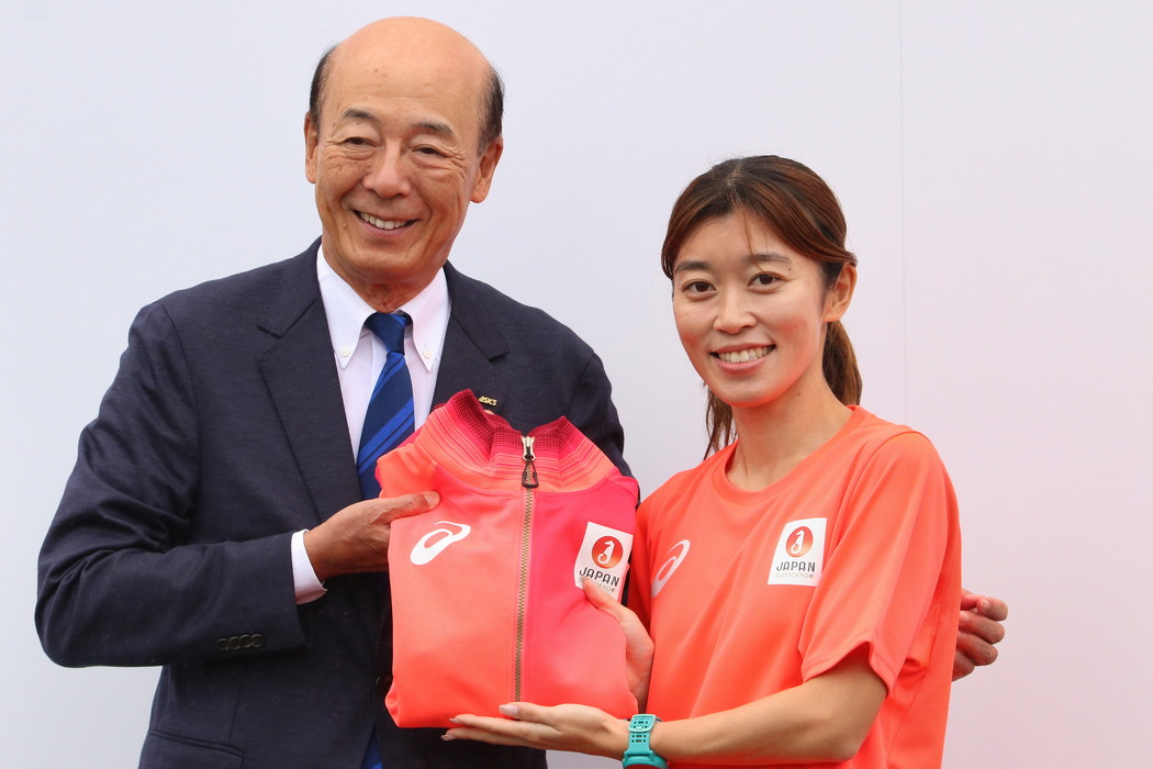 贈呈式では、日本選手団副団長の粟野達人さんと、デフ陸上女子中距離代表でメダル獲得を目指す岡田選手が、選手団を代表して公式ユニフォームを受け取った。