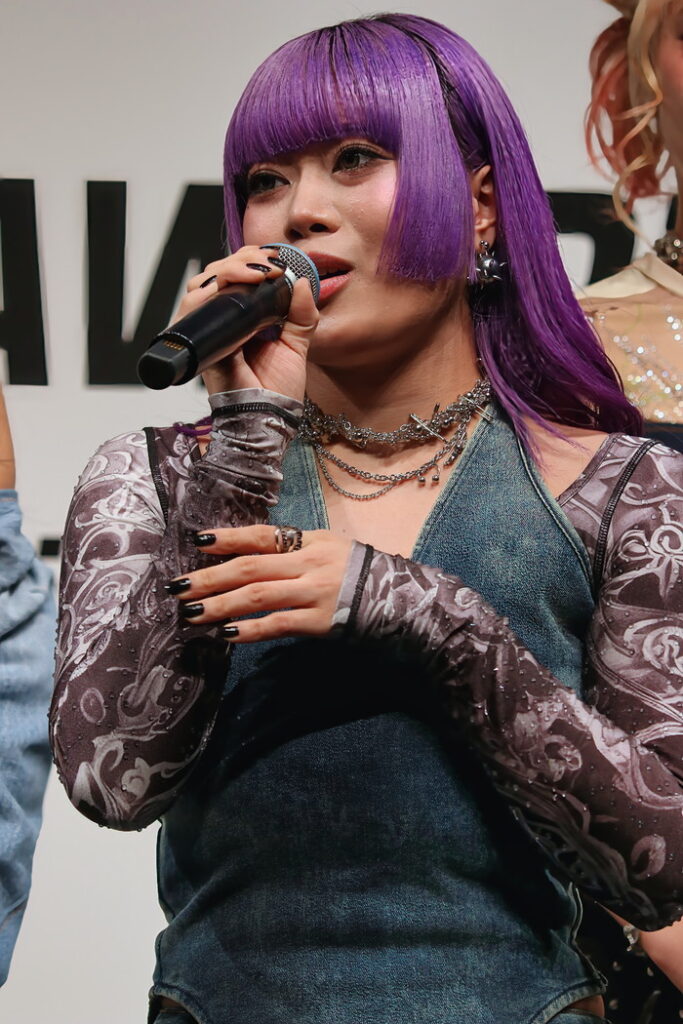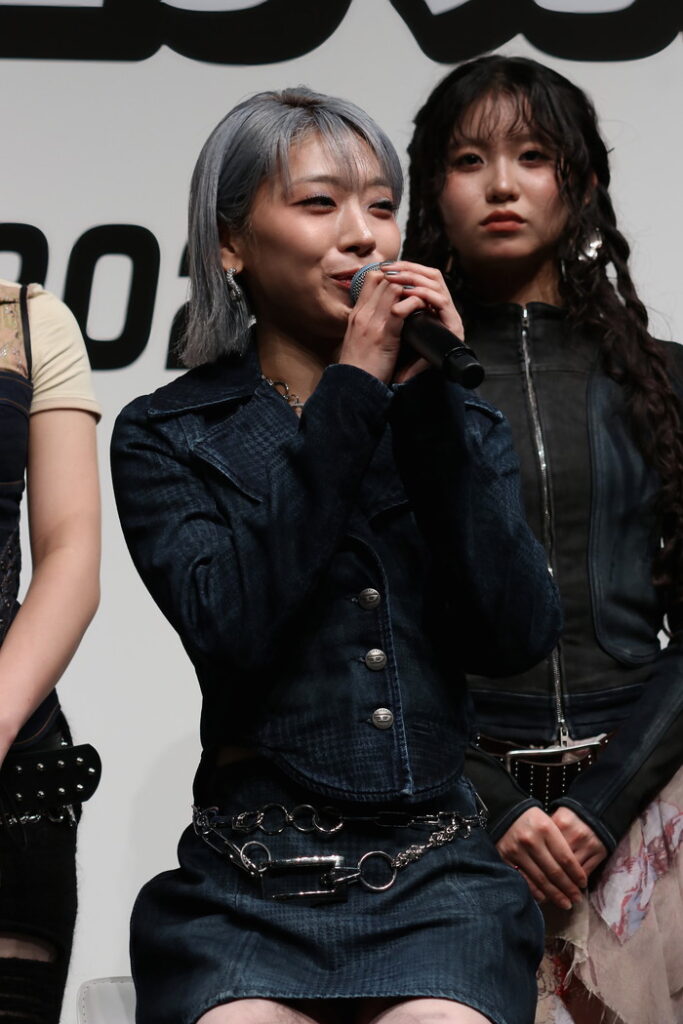 また、CHIKA(チカ)さんは自身のスタイリングについて「今日のポイントはこのパンツです。もともとつなぎになっているデザインで、上の部分を切らずに折り返して、腰の位置でためて履いているのがポイントです」とした上で。「メンバーそれぞれ、デニムの色の濃淡や着こなし方のアレンジが違っていて、私たち7人の個性がしっかり出るようにスタイリングしていただきました。それぞれのスタイルが集まって、すごく素敵なコーディネートになったと思います」と話した。