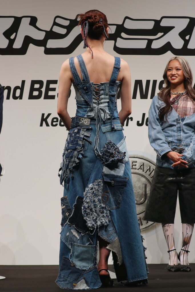 後ろの一部にはキッズ用のデニムを使っていたり、社長の奥さまのもの、スタッフのお子さんのもの、親友のものなどが組み合わされています。そうやって、いつも応援してくれる人たちと一緒に今日のステージに立てているような気がして、とても幸せです。本当に、この特別な日にふさわしい一着を着ることができてよかったと思います」とコーディネートのポイントを説明した松本さん。