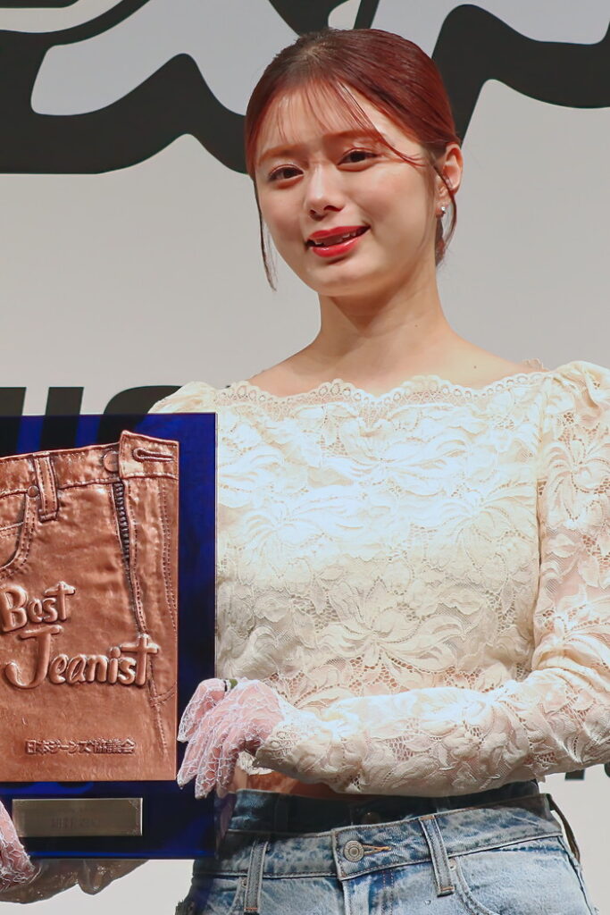 紺野さんは「毎日と言っていいほどジーンズを履いているので、このような栄えある賞をいただけて本当に光栄です。率直に、とても嬉しく思います」とした上で、当日の衣装について、「きらびやかな会場なので、それに負けないよう、スタッズがたくさんあしらわれたデニムを選びました。アクセントとして、デニムを重ね履きしているところがポイントですデニムを下にもう1枚履いています」と説明。「デニムのように風合いを増す人でありたい。毎日履いていても飽きることがなく、どんどん風合いを増していくこのジーンズのように、私自身も成長し、何度見ても飽きられないようなお仕事をしていきたいと思います」と話した。