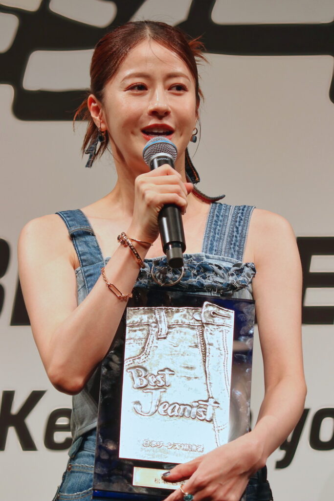 松本若菜さんは「毎年見ていたこのベストジーニスト賞の舞台に、まさか自分が立てているということが本当に不思議でもあり、それ以上に、心からうれしい気持ちでいっぱいです。この賞をいただけると聞いてから、今日の授賞式にはどのジーンズを履いて行こうかと、少しワクワクしながらこの日を迎えました。今後もこうしてジーンズのことを、さらに愛していくんだろうなと思うと、これからの毎日がもっと楽しくなっていく気がします。ジーンズとともに人生を歩んでいきたいと思います」と笑顔。