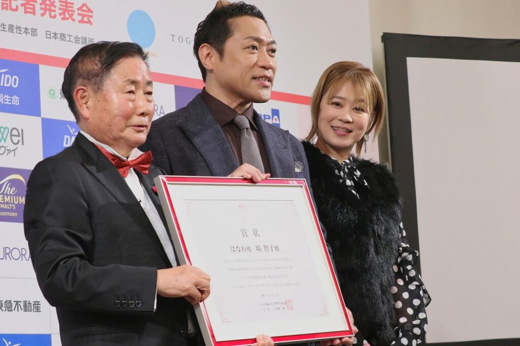選考理由では、はなわさんの芸歴30年を通じた活躍や、作詞作曲した『お義父さん』で“幸せな家庭だけを夢見る美しい女性”とうたわれた塙智子さんとの、和気あいあいの夫婦愛が挙げられた。