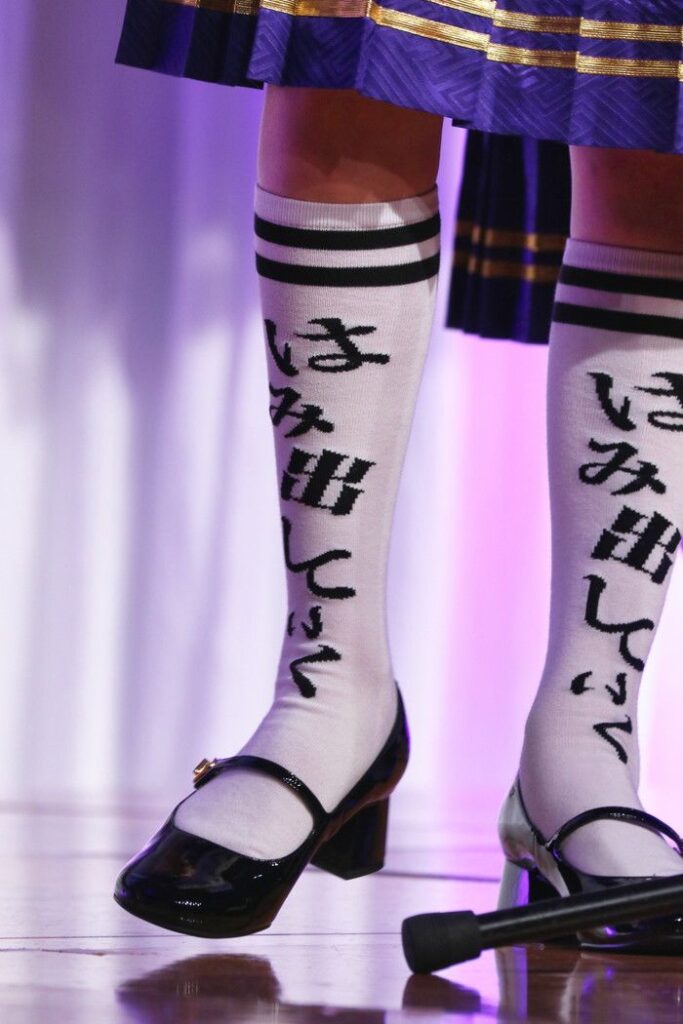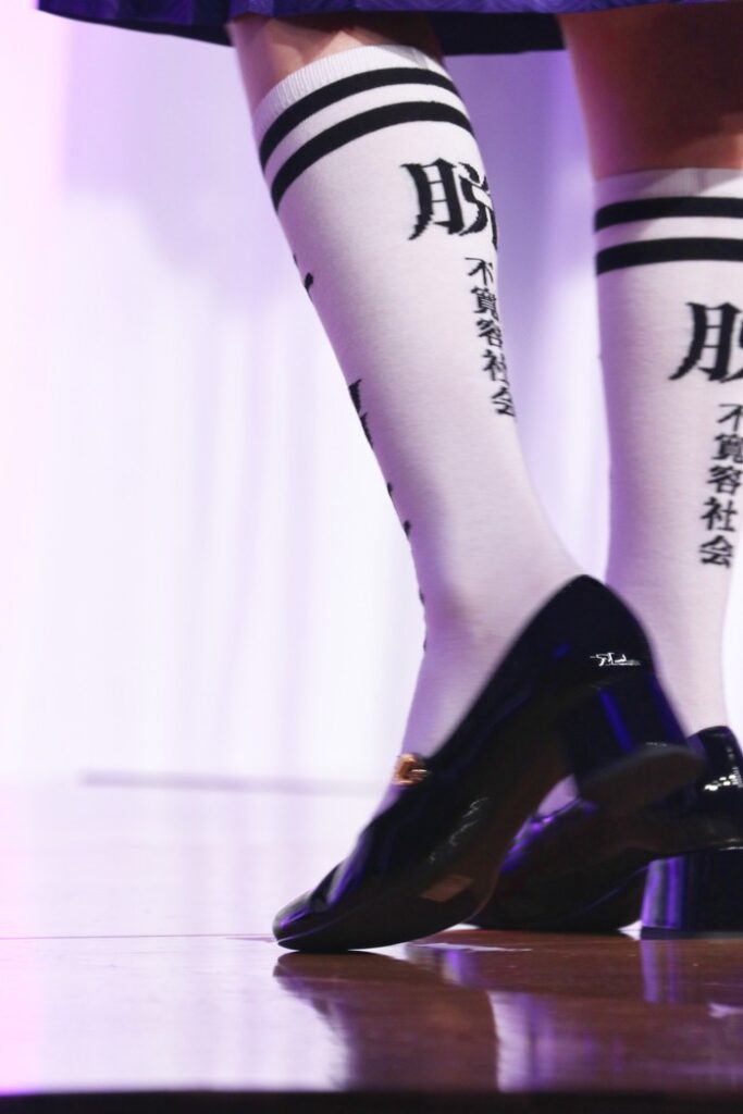 この日のハイソックスには、前には「はみ出していく」という言葉が書かれていた。「後ろにもメッセージが入っていて、脱不寛容社会です。この靴下は、結成当初にデザインしたものなんですけれども、少し強めの言葉かもしれませんが、より自由に、個性や自分らしさがはみ出せる社会をつくっていこうという、私たちなりのメッセージを込めました」と語り、アイデンティティも示した。