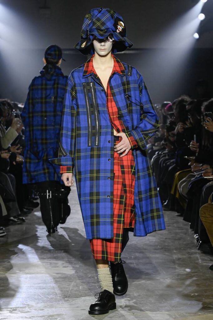 カットアウトされた服地、キルトスカート、伝統的なタータンチェック、ベルトで締めるボンテージ、セーフティピンやメタル装飾、パイピングを施したディテールなどを展開。ジャカード織からリフレクター素材まで、幅広いファブリックを採用している。