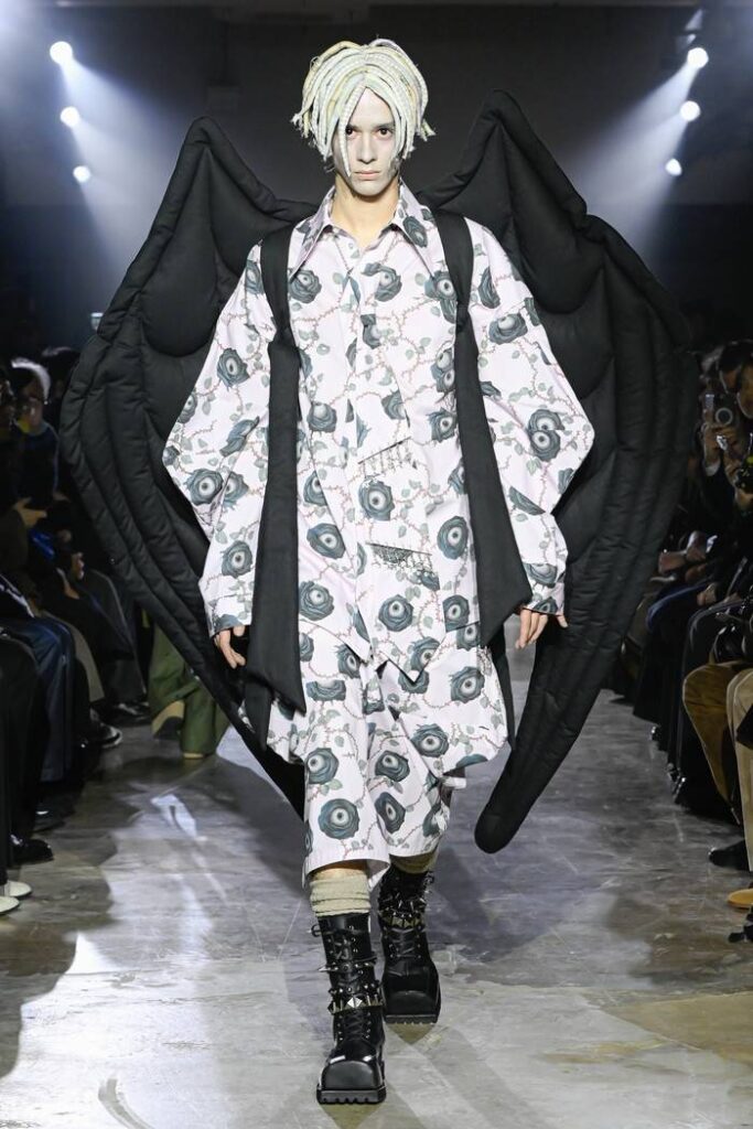 コレクション全体には、トレヴァー・ブラウンのアートワークが随所に用いられている。身体を覆うほど大きな悪魔や天使の羽、少女のグラフィックを横断するチュールなどが、衣服の造形として取り入れられた。
