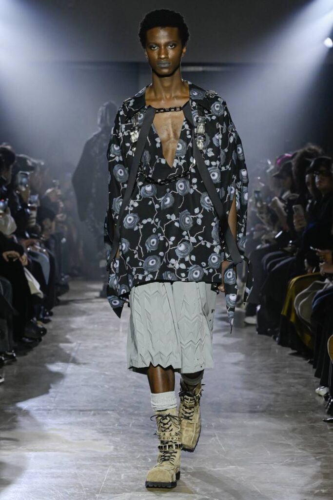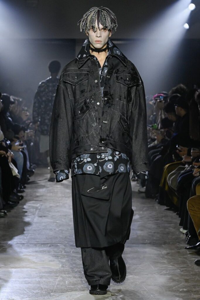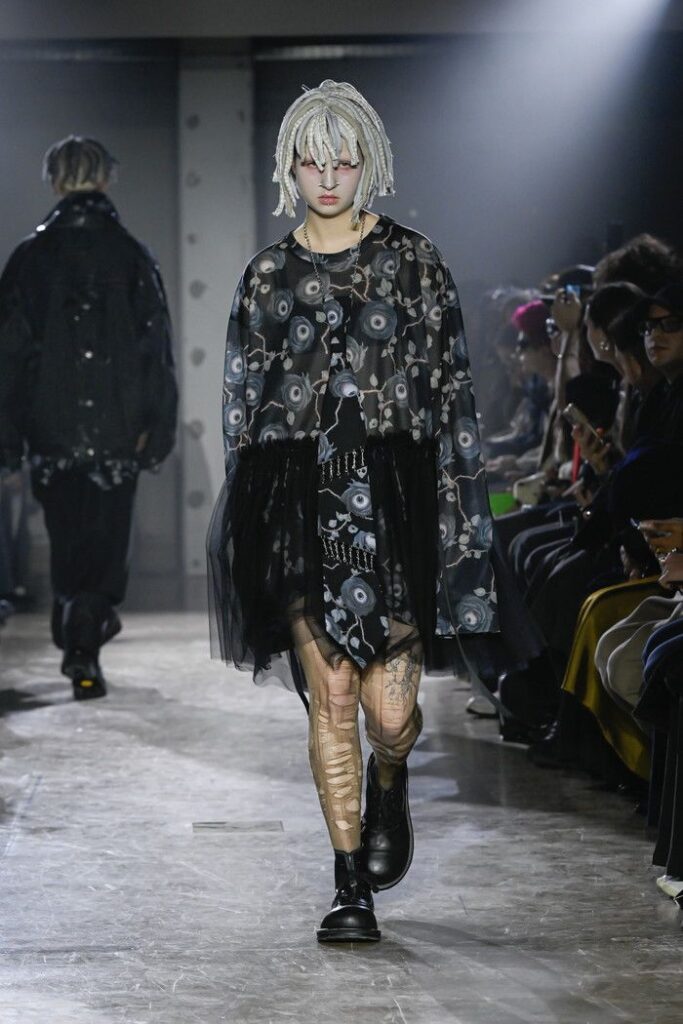 2026/2027年秋冬コレクションでは、スモーキーで淡いカラーパレットに、ブラックのシリコンラバーによる汚し加工を施した素材表現を用いた。柔らかさと硬質さの異なるテクスチャーを同一のアイテム内で組み合わせる手法が随所に見られる。