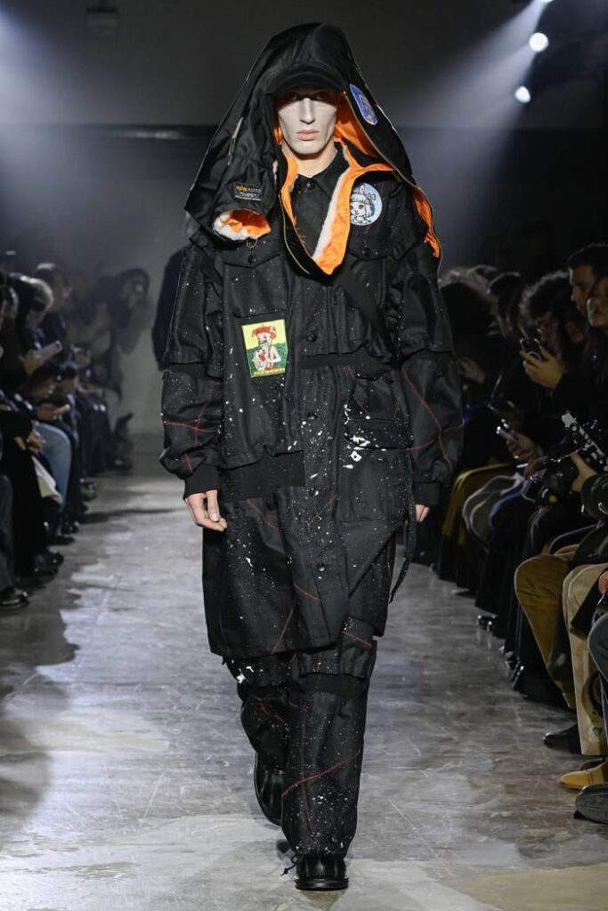 アンブロ(UMBRO)とのコラボレーションではスポーツウエア特有の機能的なパターンワークを基に、40カ所以上の切り替え部分にアジャスターを組み込み、着用者がシルエットを調整できる仕様とした。腰まで伸びるフードは、コレクション全体に配置されたトレヴァー・ブラウンのタロット風アートワークと呼応している。