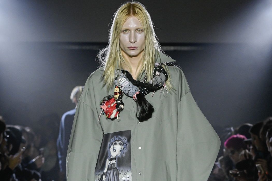 コレクション全体には、トレヴァー・ブラウンのアートワークが随所に用いられている。身体を覆うほど大きな悪魔や天使の羽、少女のグラフィックを横断するチュールなどが、衣服の造形として取り入れられた。