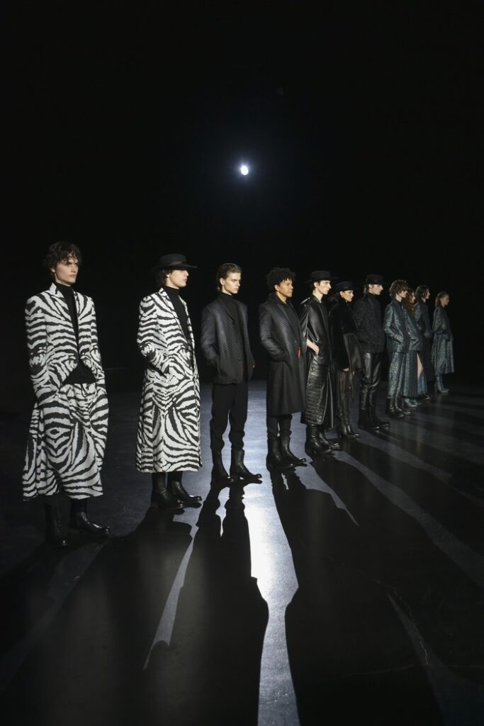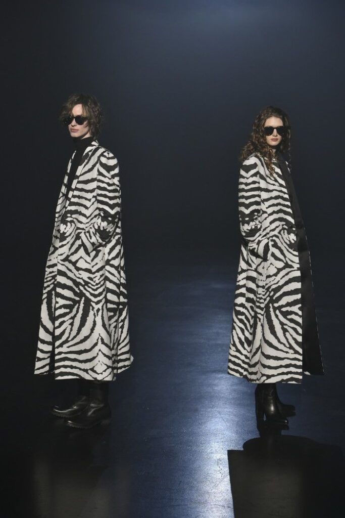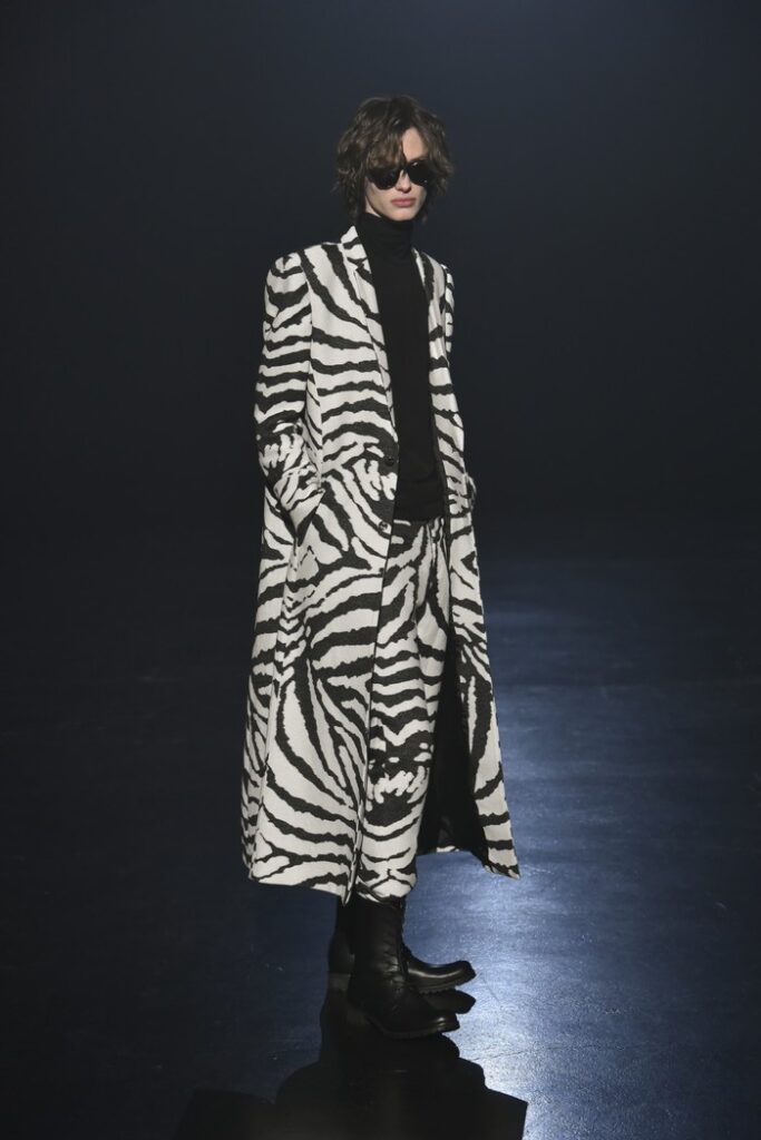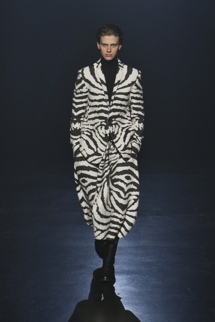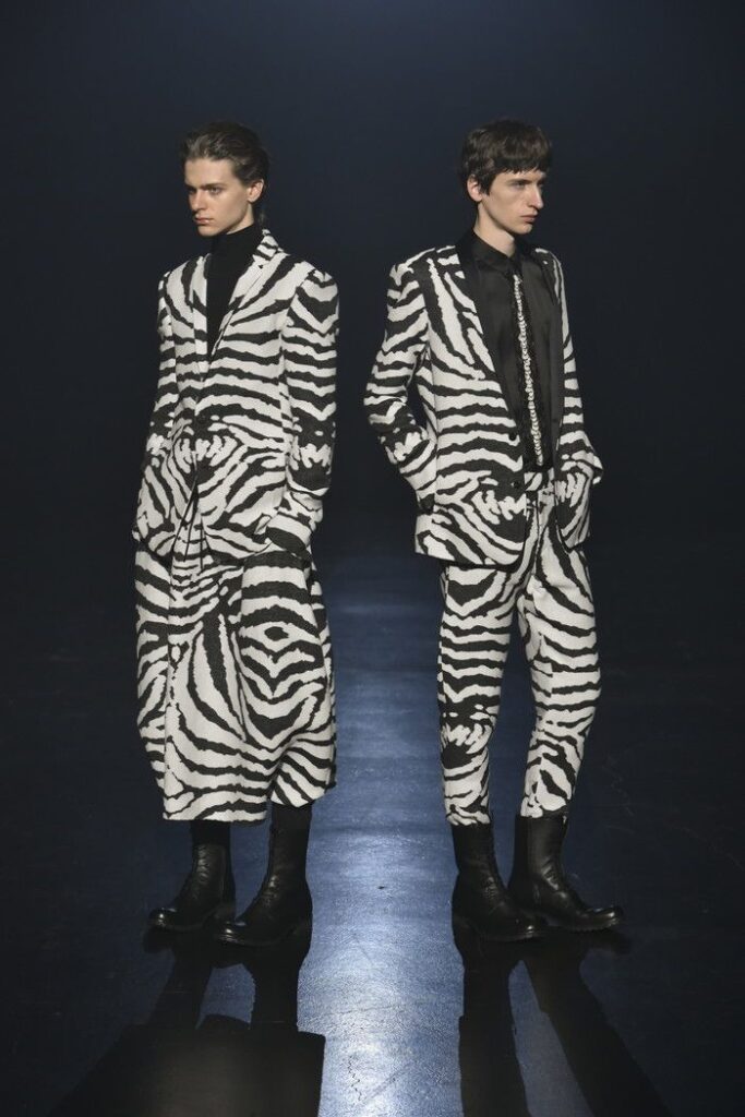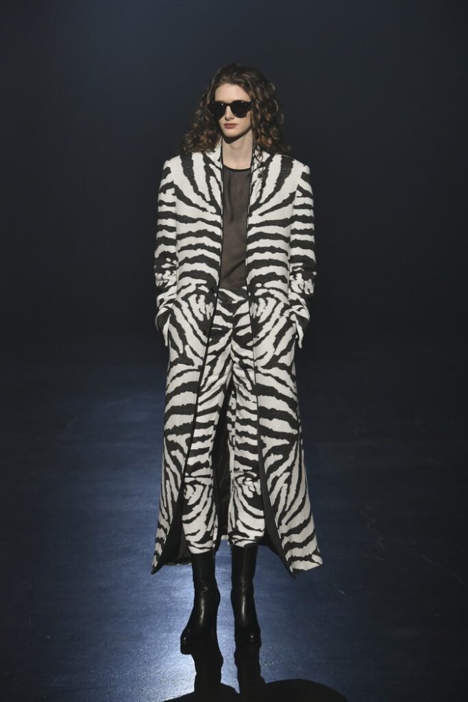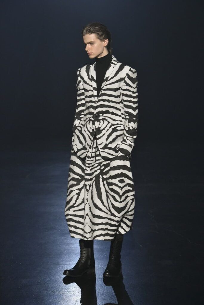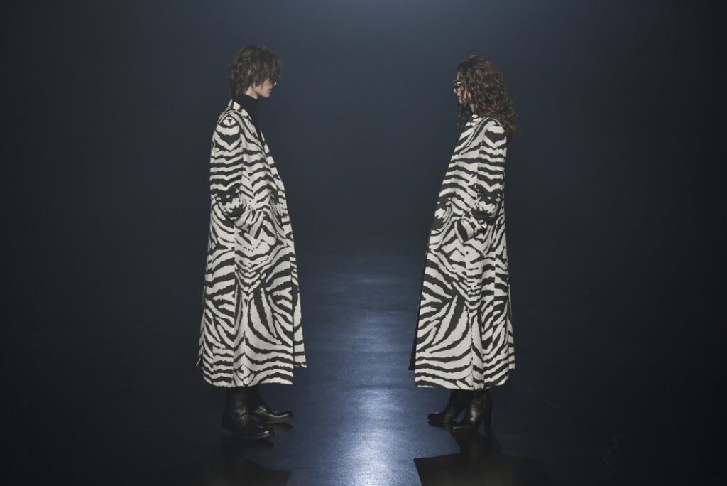 白黒のゼブラ柄ジャカードは、デザイン画を思わせるタッチで構成し、野性的なムードと洗練を併せ持つテーラードとして提案。ウール/シルクのドット柄ドビー織りには黒のグラデーションを施し、モダンなグレンチェックがシアーに見え隠れする視覚的効果を加えた。