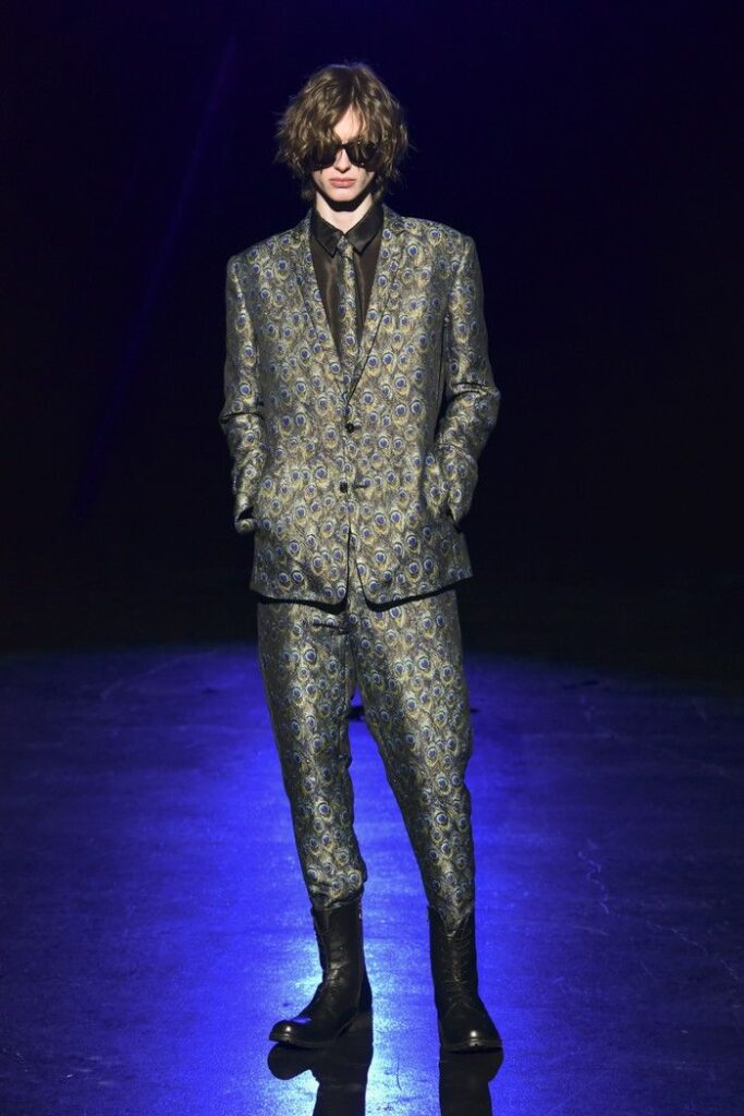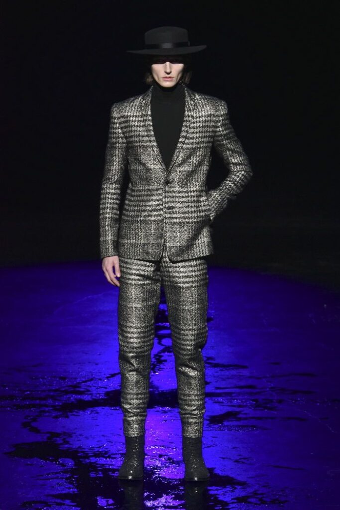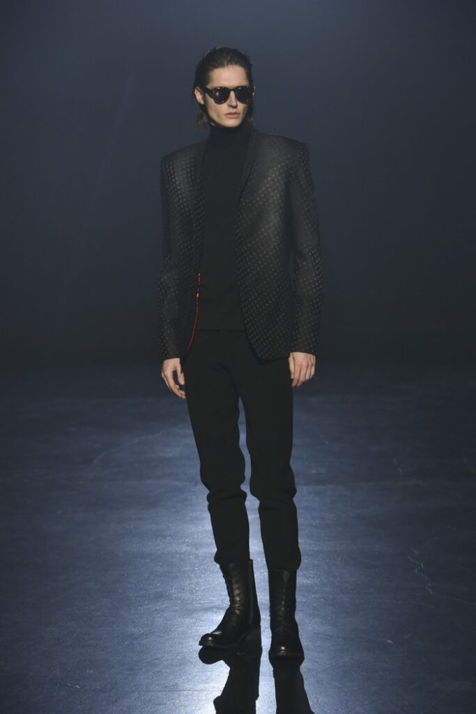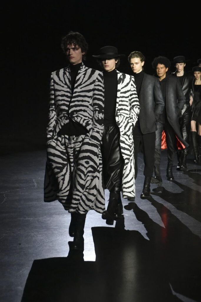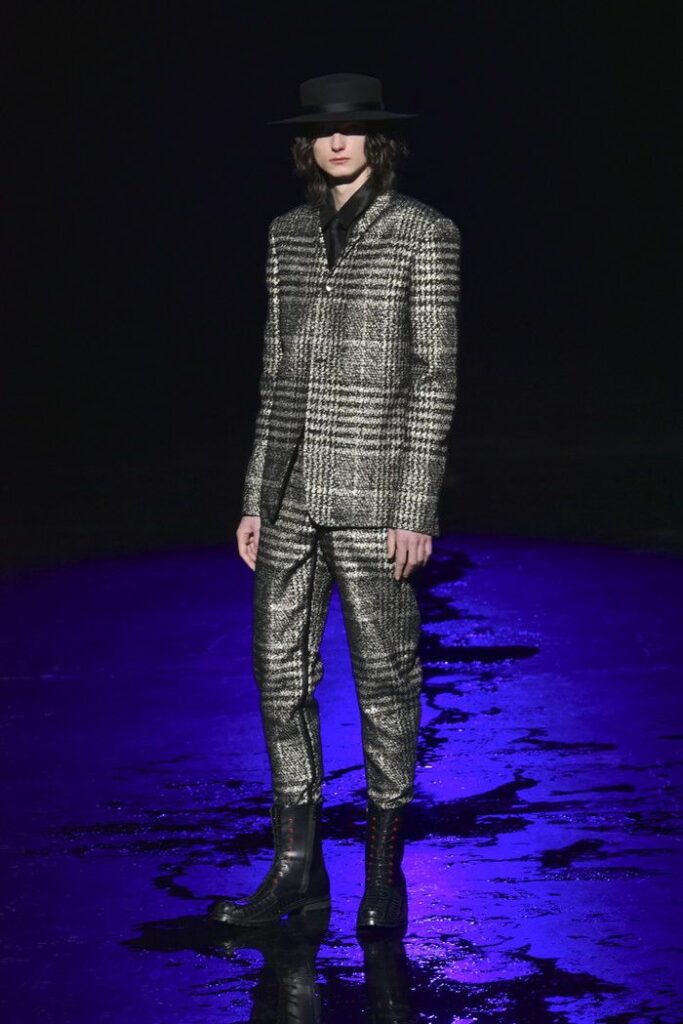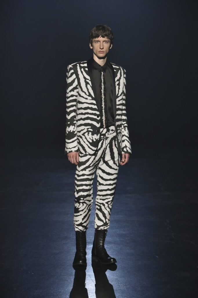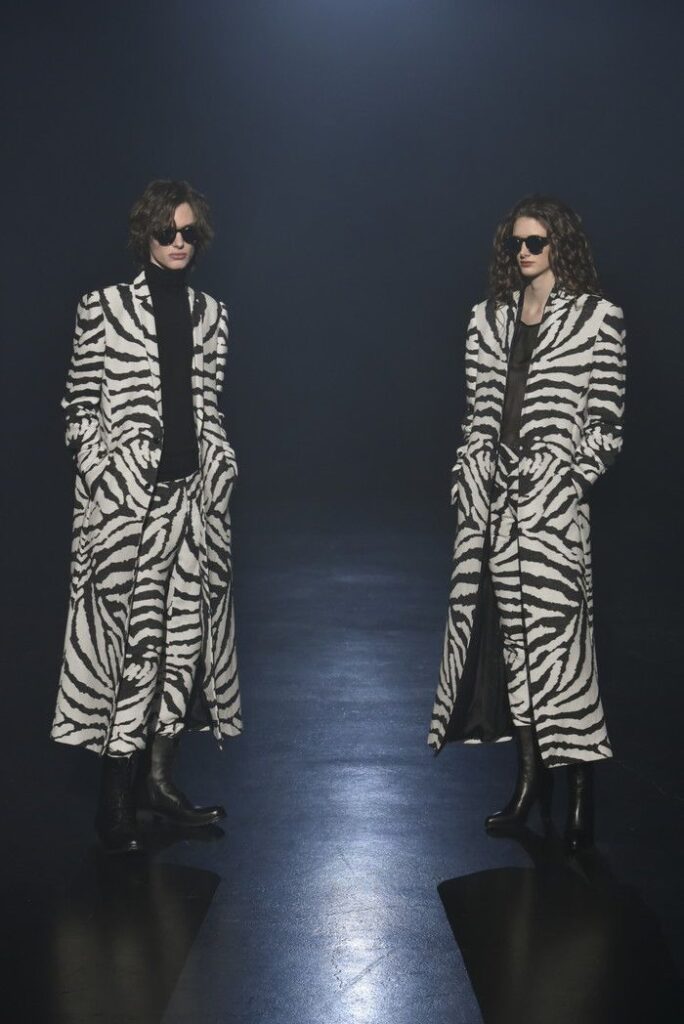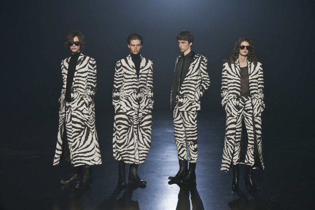 白黒のゼブラ柄ジャカードは、デザイン画を思わせるタッチで構成し、野性的なムードと洗練を併せ持つテーラードとして提案。ウール/シルクのドット柄ドビー織りには黒のグラデーションを施し、モダンなグレンチェックがシアーに見え隠れする視覚的効果を加えた。