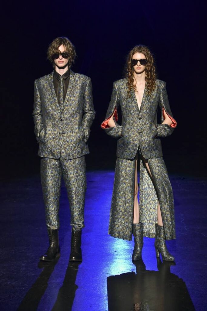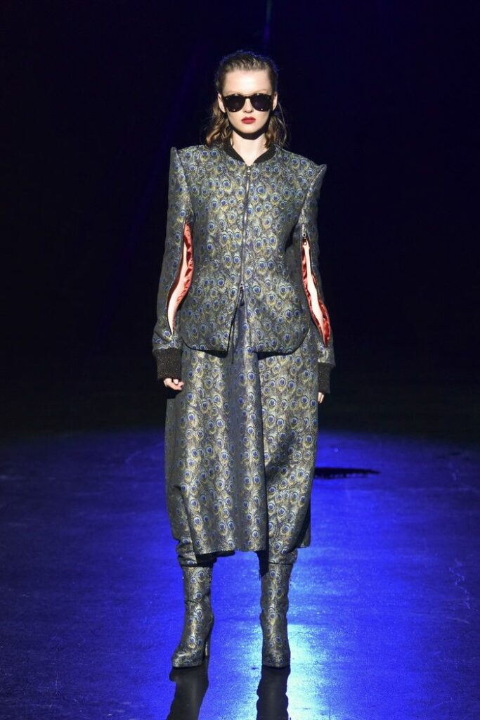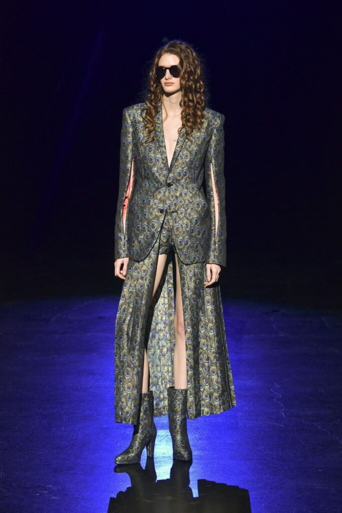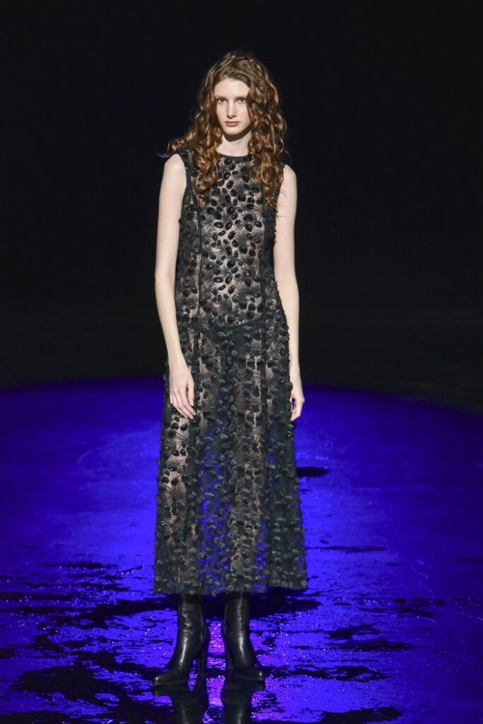サイズネームタグを幾重にも重ねて縫い合わせた再構築生地は、サステナブルな取り組みから生まれたもの。黒のチュールに黒の花弁を立体的に縫い付けた素材や、多彩なラメ糸を織り交ぜたピーコック柄のジャカード生地も使用。異なる素材を組み合わせることで、シルエットに陰影と動きを与えた。