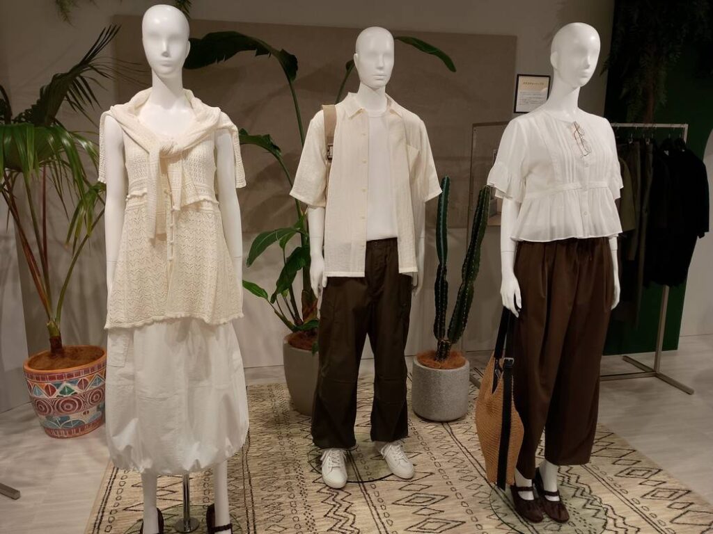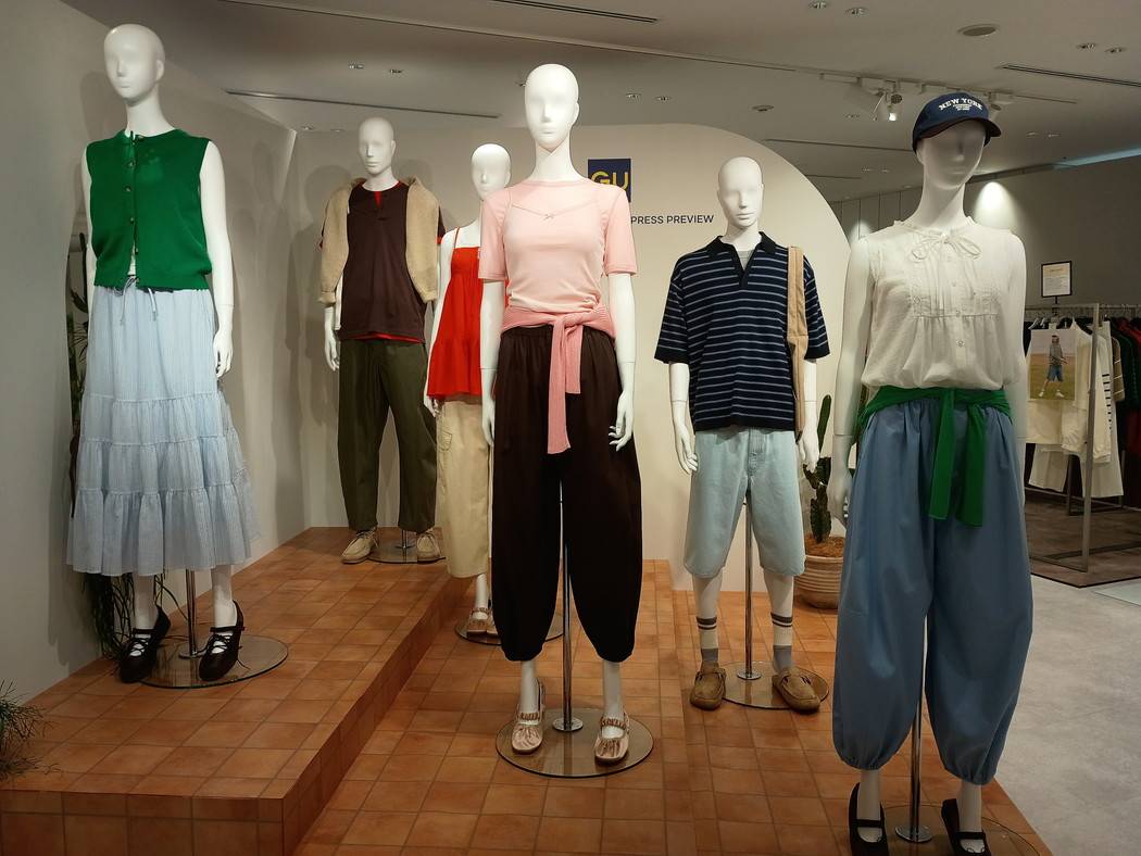 ジーユー(GU)は2026年春夏展示会で、透かし編みニットやバレルレッグパンツなどを軸に、夏のテーマ「シティボヘミアン」を打ち出した。ウィメンズ、メンズともに軽さや素材感を生かした商品をそろえ、ドライ素材などの機能性も取り入れながら、暑い季節に向けたスタイリングを提案している。